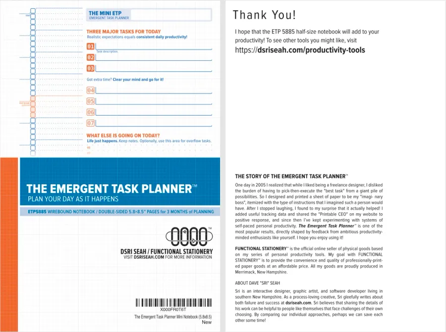 I am putting the Emergent Task Planner Half-Size Notebook into production for one final run of 1000 unitsThese will be redesigned and relaunched, so this is just the final run of the old design. The shrinkwrapped version of this notebook includes a insert that has the Amazon FBA code on the front and some text on the back, and I needed to update it so production could proceed at Papergraphics, the commercial printer I've been using since 2009 right here in New Hampshire.