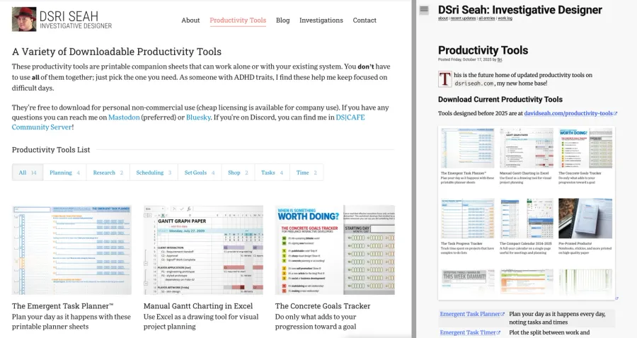 dsriseah.com/productivity-toolspage (upper right) that has a clickable image that goes back to the old site, with a few Quick Links. Eventually, I'll be redoing all the old forms with new branding, getting away from the "functional stationery" identity.